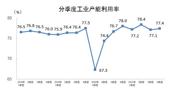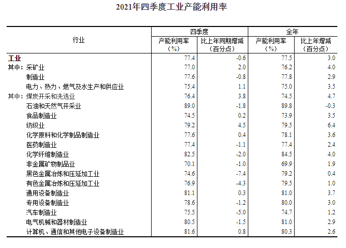 2021年四季度,全国工业产能利用率为77.4%,比上年同期下降0.6个百分点。2021年全国工业产能利用率为77.5%,比上年上升3.0个百分点。