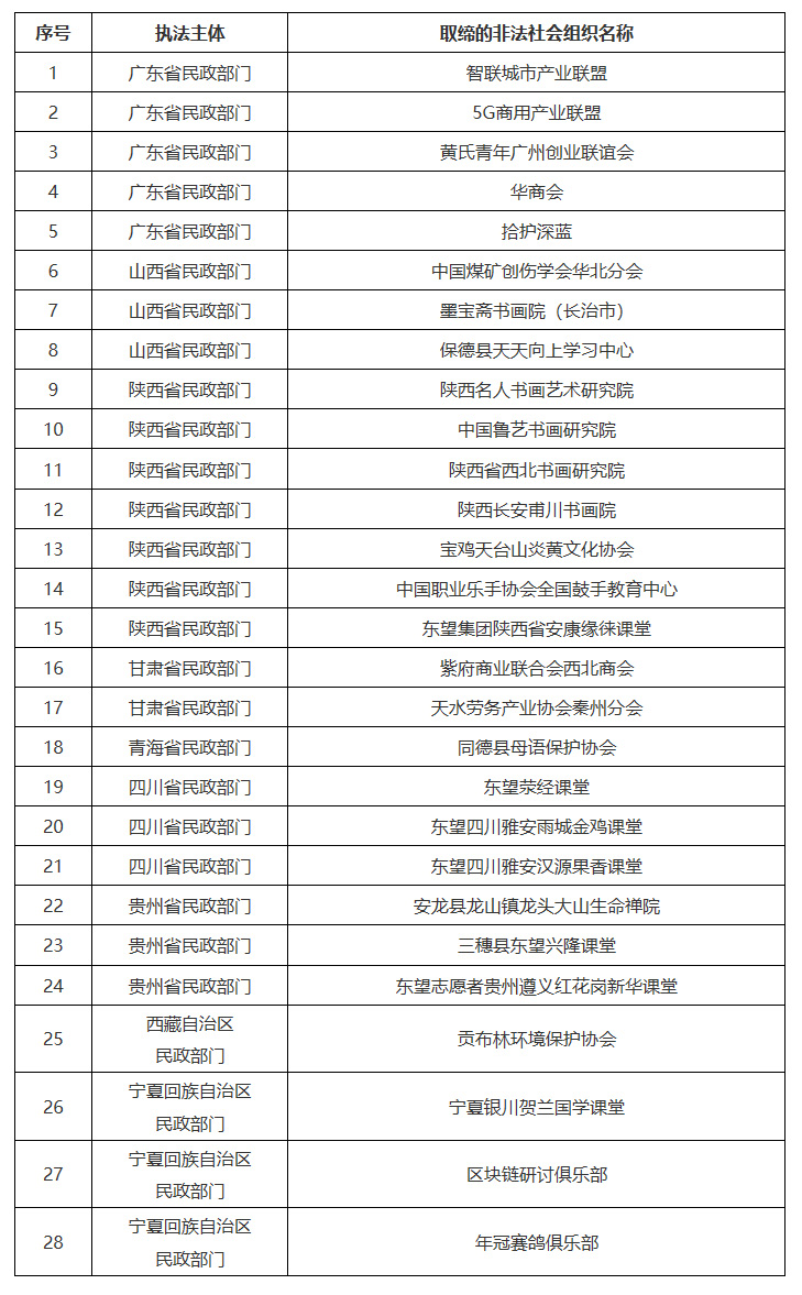 为持续加大舆论宣传力度,提高公众防范意识,发挥社会监督作用,现向社会公布第九批地方民政部门依法取缔的部分非法社会组织名单。社会公众如果发现名单中的非法社会组织仍在开展活动的,可依法向公安机关报案。同时,提醒有关机构和社会公众,在与社会组织开展合作或参与其活动时,请通过“中国社会组织政务服务平台”(www.chinanpo.gov.cn)、“中国社会组织动态”政务微信(微信号:chinanpogov)核实其身份,避免上当受骗;也欢迎社会各界通过“中国社会组织政务服务平台”提供涉嫌非法社会组织活动线索。
