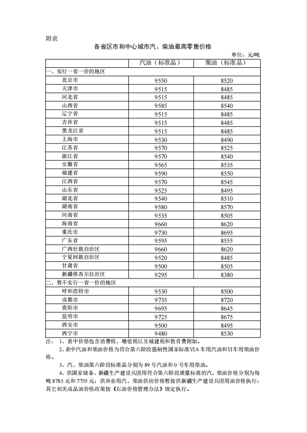 附:各省区市和中心城市汽、柴油最高零售价格