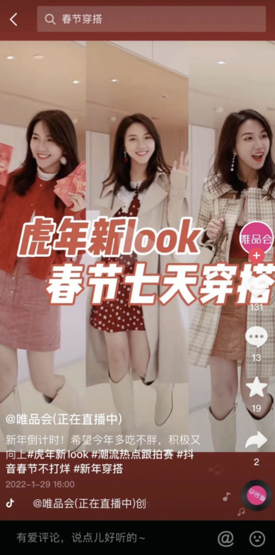 此外,抖音电商服饰行业还强化春节拜年各种场景下的虎年全套穿搭的“total look”概念,将货品穿搭与新年场景强关联,在营造新春氛围的同时,向消费者传递“虎年新look,尽在抖音电商”的认知。