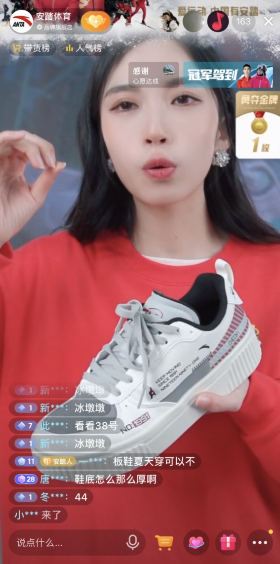 冬奥期间,安踏通过直播间氛围装修、短视频热点宣发、冠军驾到栏目等,成功创造势能,流量冲破峰值,PV爆发10倍,成交爆发20倍,三款主力商品成交额均破百万。