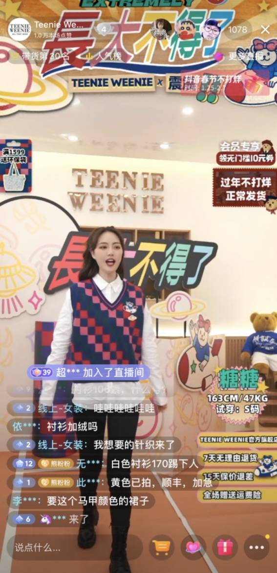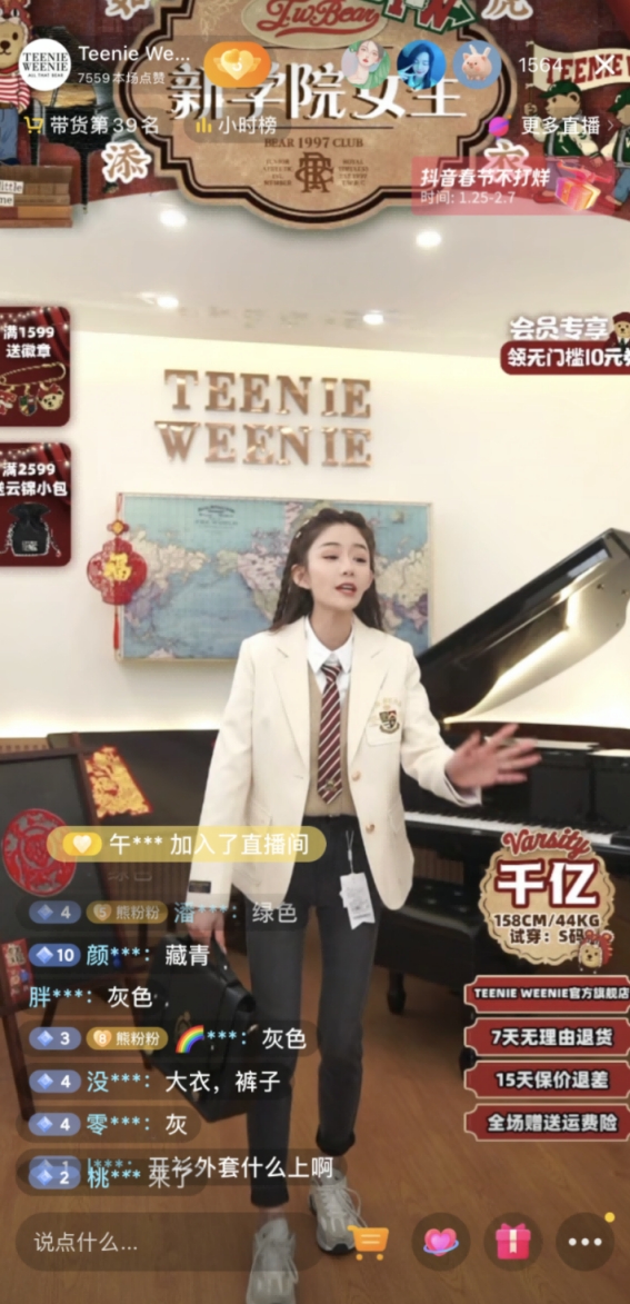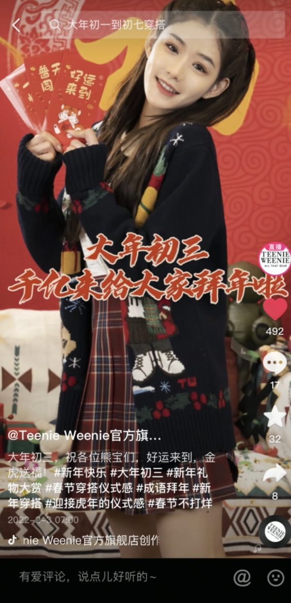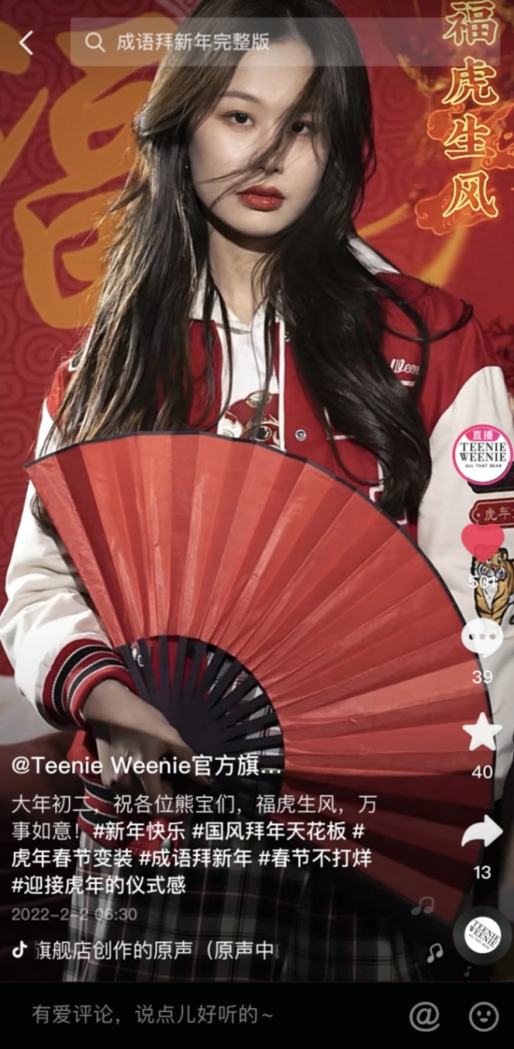 新品营销对服饰类商家至关重要。借势春节热点,Teenie Weenie卡位上新,抢跑同类女装服饰,并通过新春氛围感穿搭,将新品服饰与过年特色主题场景强关联,向消费者传递新春穿经典学院风更出挑的心智。