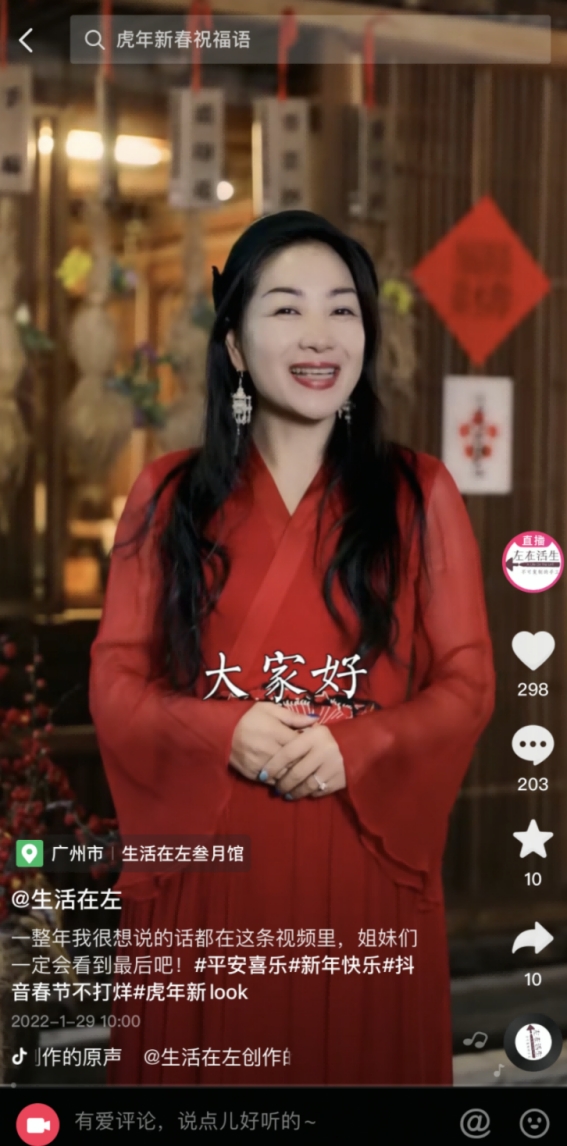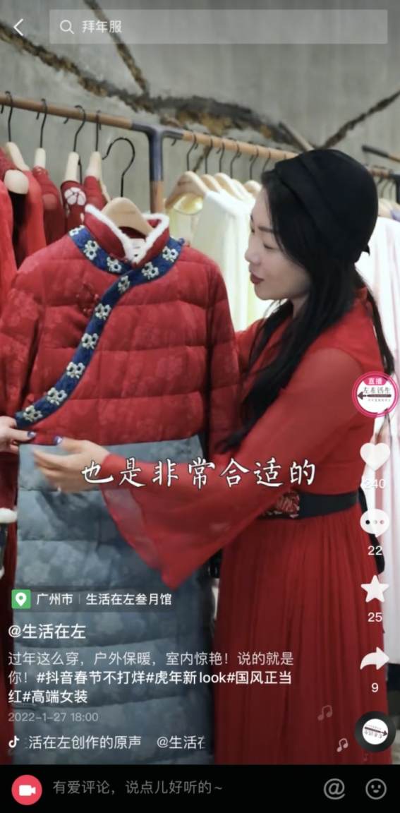 过年期间,生活在左因为独立设计的特色国风服饰,与新春场景十分匹配,精准击中了仪式感较强的中年女性群体的消费需求喜好,在一众服饰品牌中脱颖而出,成功抢占追求过节仪式感的中年女性市场。