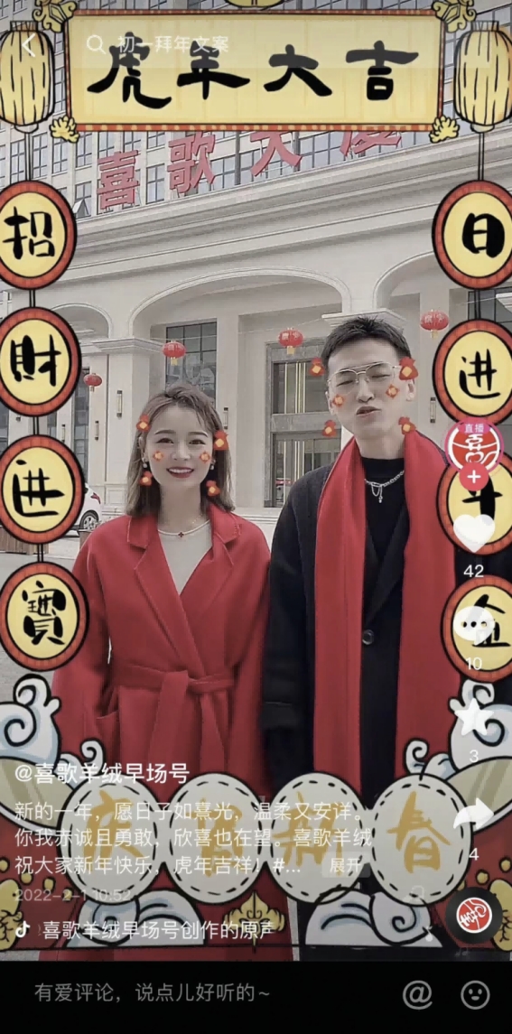 在这个春节,来自王牌工厂项目的优质羊绒品牌新号@喜歌羊绒早场号 悄悄上线抖音电商,与主号相互配合完成账号冷启动,成功实现新账号活动总成交额成功突破160万。除了高品质面料和与新春场景相配的设计,营造新春场景感也是喜歌羊绒开门红的原因之一。