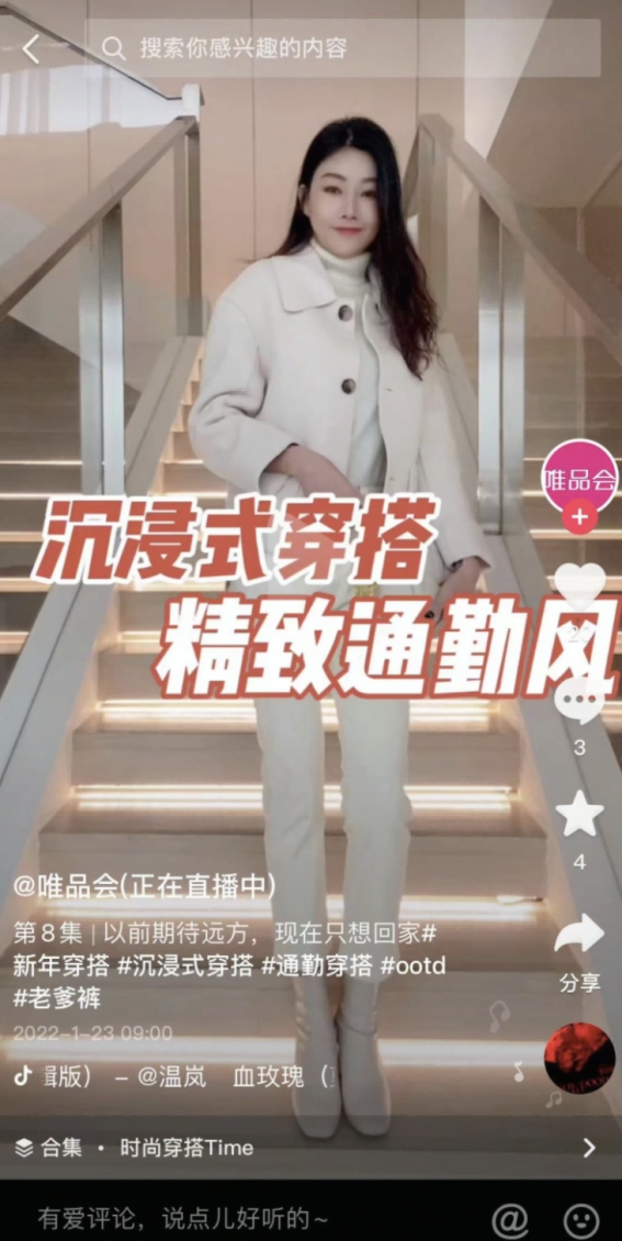 除了发布多条复工通勤total look主题的短视频,将新春活动与复工场景相关联外,唯品会还发起了沉浸式穿搭教学活动,通过精致得体的整体穿搭视频,展现应季单品的整套搭配,成功降低消费者的决策难度,提升成单率和客单价,其中机能皮夹克更是成为百万销量爆款单品,并带动了其他多款单品的销售。
