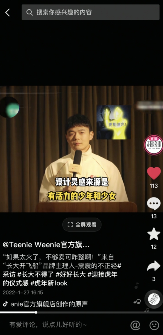 春节活动期间,针对消费者人群特点和新年场景需求,Teenie Weenie发布了多款新品。结合年轻消费者新年年岁渐长的特点,Teenie Weenie将新年换新和春季上新有机结合,推出“长大不得了”复古运动系列,并邀请多位站内KOL穿同款新衣发表自己的“长大”感言,引导消费者沉浸式代入到复古年代的回忆中。
