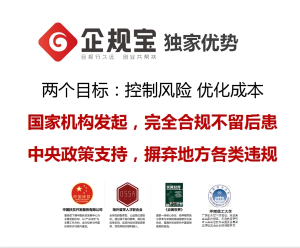 ”企规宝”是企业财税合规工具化服务平台,依托信息技术,应用业务流程管理外包(BPO)工具,通过重构优化交易控制风险、降低财税和用工成本,帮助企业完成低成本合规并账、实现财税阳光化。平台由三个国家机构和一个双一流学术委员会华工共同发起,联合资深企业合规专家、财税专家、法律专家、信息技术实施专家、双一流高校博导共同运营。