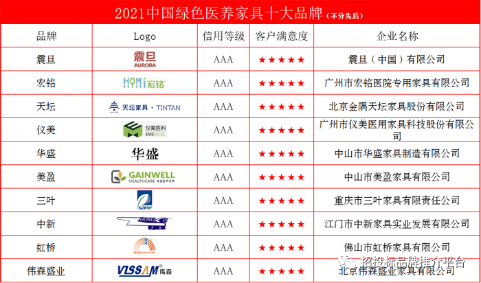 招投标供应链品牌推介平台为推动医养家具企业加强品牌建设和践行绿色发展理念,提升绿色品牌的知名度和美誉度,扩大医养家具品牌市场影响力,特举办了“2021中国办公及商用家具评价推介”活动,据悉,此活动受到业内及社会各界人士的广泛关注和热情参与,宣传展示知名品牌企业510余家,网络公众满意度市场调查投票共达829.3262万余票。各企业数据由机构推荐、企业自荐、大数据采集构成,并由来自质检、环保、认证、行业协会等专家对各品牌进行了综合评审,在全国家具行业中甄选出诚信、优质、绿色、环保、服务能力强、综合实力突出的“2021中国绿色医养家具十大品牌”供应商,展现企业良好品牌形象,充分发挥品牌引领作用,为广大消费者、采购单位、经销商、代理商等各方提供参考。具体如下: