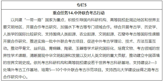 落实习近平总书记关于开展亚洲文化遗产保护行动的重大国际倡议,健全境外考古工作机制,编制中外联合考古专项规划和项目指南。实施中外联合考古行动,支持国内考古力量赴境外开展联合考古项目,吸纳国外考古机构、高等院校在中国境内开展合作考古研究,拓展人员培训和交流渠道。继续举办国际性考古学术大会,打造国际化考古专业期刊,推进以联合出版等方式,译介国内重要考古成果,翻译国外重要考古报告、论著,及时掌握国外考古前沿动态,扩大中国考古成果国际传播。