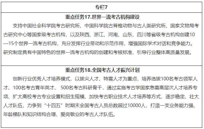 支持国家级和省级考古机构创建世界一流考古机构,建立考古发掘资质单位能力评价体系。推动健全考古专业教育培训体系,逐步完善高等教育、职业技能教育、在职人员继续教育。推动考古学科建设,支持有条件的高等院校增加或扩大考古专业设置和招生规模,建设一批一流考古学专业。促进高等院校和考古机构共同推进考古学学科体系建设,实施考古学国家急需高层次人才培养专项。推动培育5—10所考古职业技能教育机构,探索建立“1+X”考古探掘工培养和职业技能等级证书制度。推动考古从业人员定期在职培训常态化,加大考古工作薄弱地区和基层从业人员倾斜力度,依托中国社会科学院考古研究所、中国科学院古脊椎动物与古人类研究所、北京大学、吉林大学等建设3—5处考古人才培训基地、5—10处田野考古实习基地。
