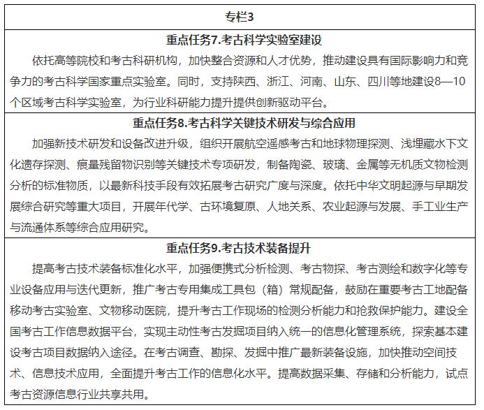推动国家级和省级考古科学实验室建设,全面提升科技考古科研环境和条件。积极培育前沿交叉学科,支持考古年代学、地质考古、动物考古、植物考古、考古材料科学、分子生物考古等分支学科,全面提升多学科协同解决考古学问题的能力。促进考古科学关键技术研发和考古技术装备改进升级,推动考古发掘科技分析常规化,增强考古发现、科技检测分析、信息提取、实验室考古、发掘现场文物保护等方面能力。完善升级全国考古发掘信息管理系统,建设全国考古工作信息数据平台,促进考古资料整理和数字化。