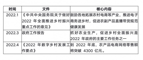 4月,中央网信办、农业农村部、国家发展改革委、工业和信息化部、国家乡村振兴局联合印发《2022年数字乡村发展工作要点》。《工作要点》明确指出:到2022年底,农产品电商网络零售额将突破4300亿元。