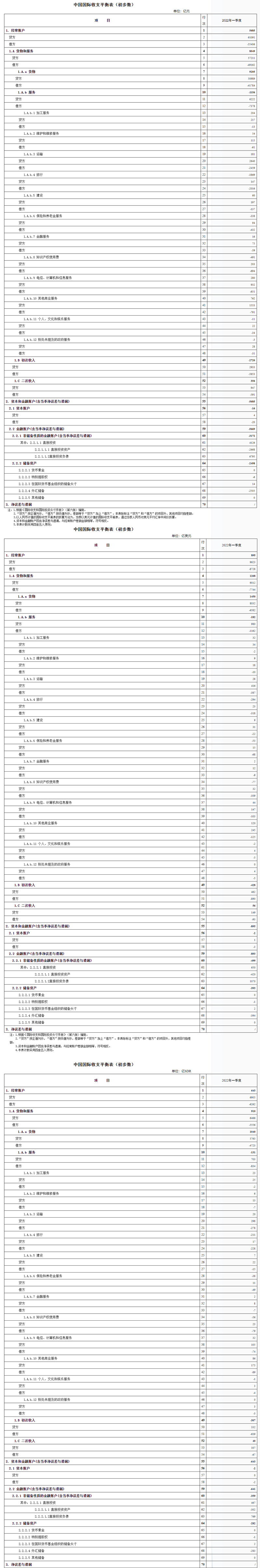 3. 季度SDR计值的国际收支平衡表数据,由当季以美元计值的国际收支平衡表,通过当季SDR对美元平均汇率折算得到。