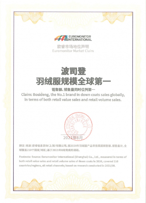 2021年,波司登首次入选国际五大品牌价值评估权威机构之一Brand Finance 公布的“2021全球最具价值服饰品牌排行榜50强(Brand Finance Apparel 50 2021)”。2022年波司登再次入选该榜单,品牌全球价值不断提升。2021年8月,世界权威市场调查机构欧睿国际发布了2020年全球羽绒服调研报告,根据报告显示,波司登羽绒服的销售额、销售量同时位列全球第一。波司登不仅向世界展示了品牌卓越潜力与魅力,更为中国服装品牌争取了更多国际话语权。