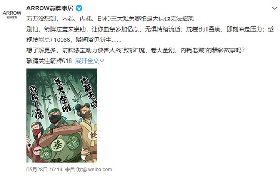 结合时下热梗,箭牌卫浴在618前期预热时生动有趣地对成年人“内卷、内耗、emo”情绪压力进行演绎。在首发条漫中,侠客深受“卷大金刚、内耗老贼、致郁E魔”的折磨,箭牌卫浴则变身“情绪抗魔法宝”,让产品与年轻消费者达成情感契机。