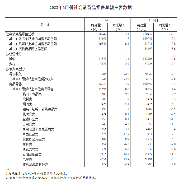 6月份,社会消费品零售总额38742亿元,同比增长3.1%。其中,除汽车以外的消费品零售额34192亿元,增长1.8%。