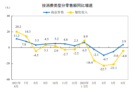 按消费类型分,6月份,商品零售34977亿元,同比增长3.9%;餐饮收入3766亿元,下降4.0%。上半年,商品零售190392亿元,同比增长0.1%;餐饮收入20040亿元,下降7.7%。