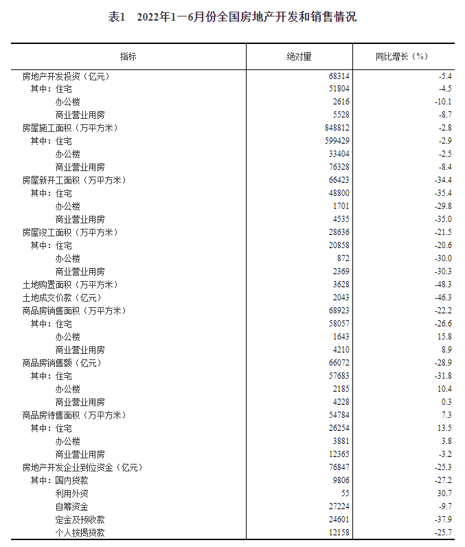 1—6月份,房地产开发企业房屋施工面积848812万平方米,同比下降2.8%。其中,住宅施工面积599429万平方米,下降2.9%。房屋新开工面积66423万平方米,下降34.4%。其中,住宅新开工面积48800万平方米,下降35.4%。房屋竣工面积28636万平方米,下降21.5%。其中,住宅竣工面积20858万平方米,下降20.6%。