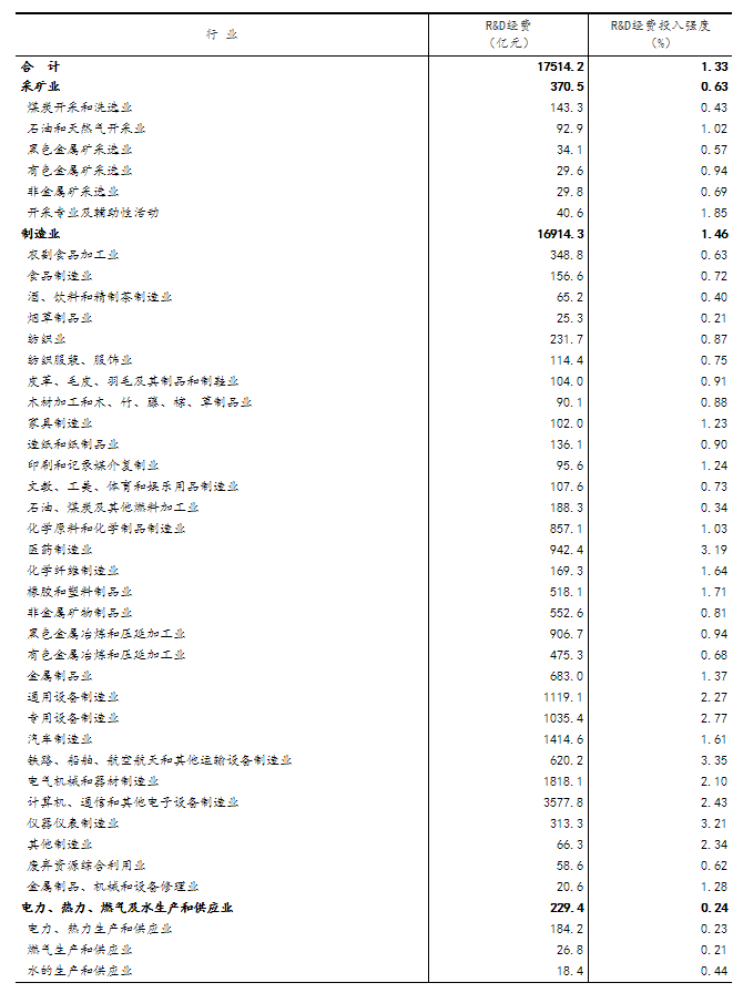 分产业部门看,高技术制造业研究与试验发展(R&D)经费5684.6亿元,投入强度(与营业收入之比)为2.71%,比上年提高0.05个百分点。在规模以上工业企业中,研究与试验发展(R&D)经费投入超过千亿元的行业大类有5个,这5个行业的经费占全部规模以上工业企业研究与试验发展(R&D)经费的比重为51.2%(详见附表1)。