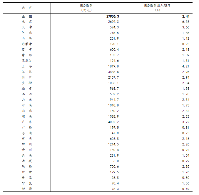 分地区看,研究与试验发展(R&D)经费投入超过千亿元的省(市)有11个,分别为广东(4002.2亿元)、江苏(3438.6亿元)、北京(2629.3亿元)、浙江(2157.7亿元)、山东(1944.7亿元)、上海(1819.8亿元)、四川(1214.5亿元)、湖北(1160.2亿元)、湖南(1028.9亿元)、河南(1018.8亿元)和安徽(1006.1亿元)。研究与试验发展(R&D)经费投入强度(与地区生产总值[4]之比)超过全国平均水平的省(市)有6个,分别为北京、上海、天津、广东、江苏和浙江(详见附表2)。