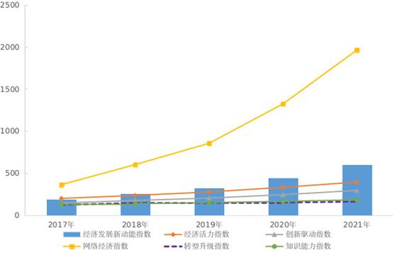 三、创新驱动指数。2021年,创新驱动指数为293.5,比上年增长20.5%,对总指数增长的贡献率为6.4%。