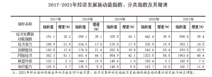 为动态监测我国经济发展新动能变动情况,国家统计局统计科学研究所在《新产业新业态新商业模式统计监测制度》和经济发展新动能统计指标体系的基础上,采用定基指数方法测算了2021年我国经济发展新动能指数,并修订了历史指数数据。结果显示,2021年我国经济发展新动能指数(以2014年为100)为598.8,比上年增长35.4%。2021年,各项分类指数与上年相比均有提升,其中,网络经济指数增长最快,对总指数增长的贡献最大。