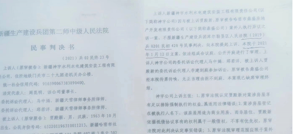 映人贾殿新与当事人口头商量无果,于 2019.9.10 日向新疆生产建设兵团库尔勒恳区人民法院起诉.执行异议纠纷(2019)兵 0201 民初 420号民事判决书,原审法院支持了原告贾殿新诉求,1、不得执行本案房屋位于哈密市天祥商厦3-301室和3-304室两套房产,2、位于哈密市天祥商厦3-301、3-304室两套房屋产权归原告贾殿新所有,于2020.9.25 结案,新疆神宇水利水电建筑安装工程有限公司不服上诉,于2021.1.12日立案,(中间整间隔110天)(2021)兵02 民终23号新疆生产建设兵团第二师中级人民法院民事判决,一、撤销新疆生产建设兵团库尔勒恳区人民法院(2019兵0201民初420 号民事判决,二驳回贾殿新原审全部诉讼请求;贾殿新不服,申请向新疆维吾尔自治区高级人民法院生产建设兵团分院再审(2021 兵申 206号于2021.12.13 结案,驳回贾殿新的再审申请。二审、再审适用法律有不合情不合理更不合法!