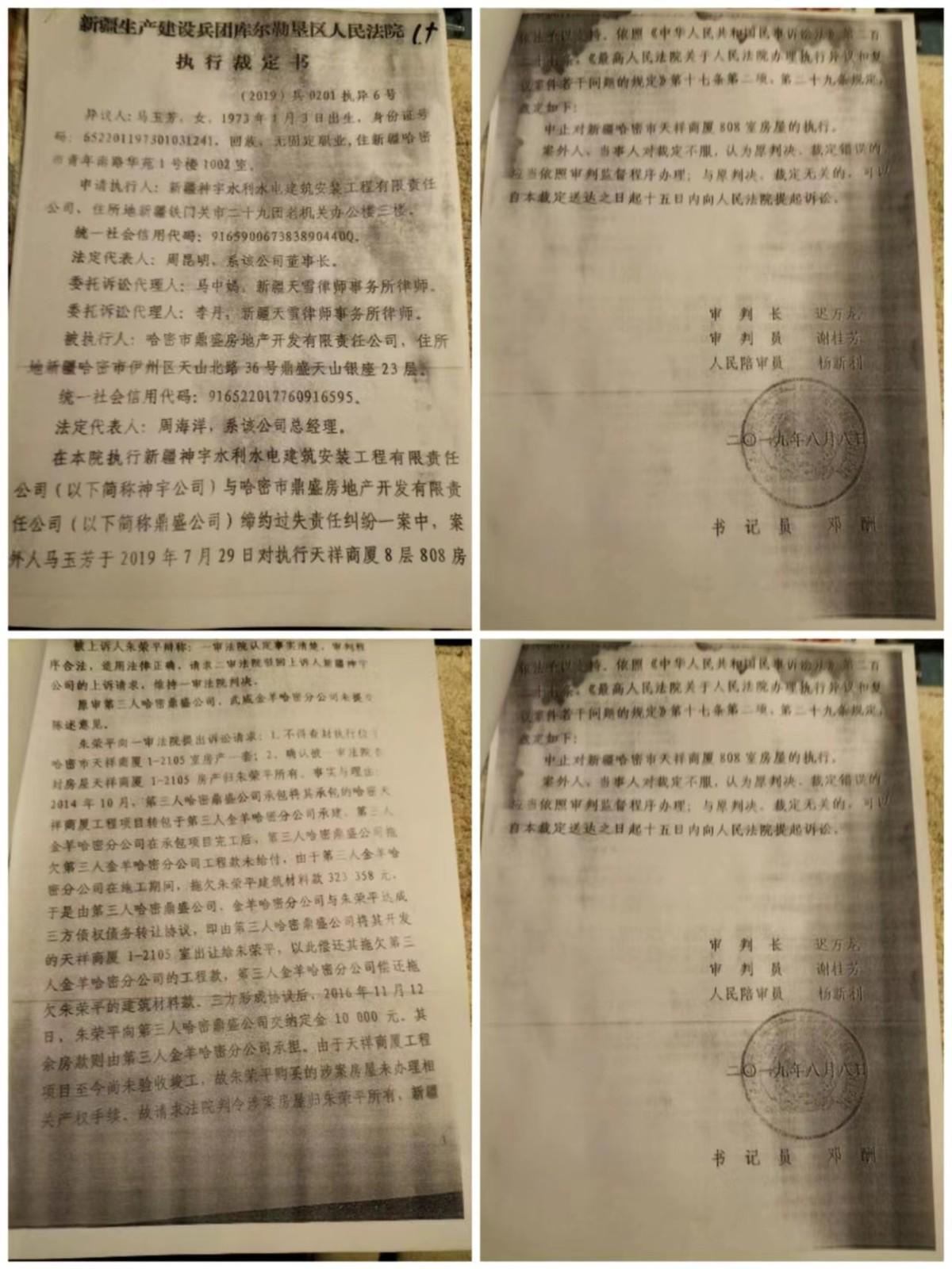 同样一、(2019)兵0201 执异6 号.案由:缔约过失责任纠纷、异议人马玉芳。申请执行人同样为新疆神宇水利水电建筑安装工程有限责任公司.同样是以物抵债(债为工资)涉案房产为哈密市天祥商厦8-808室,判决结果:中止对新疆哈密天祥商厦808室房产的执行,
