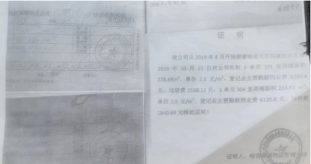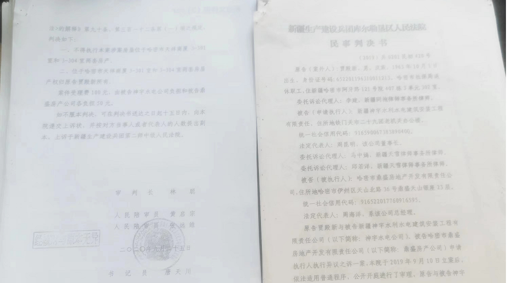 2013 年,哈密市鼎盛房地产开发有限责任公司,开发的新疆哈密市天祥商厦工程,项目资金周转困难向反映人贾殿新借款 350 万元,由于哈密市鼎盛房地产开发有限责任公司无力偿还这笔债务,经双方妥商 2017 年 8 月 16 日,将位于哈密市天祥商厦 3-301、3-304室二套房产,以房抵债.反映人贾殿新按购房程序,于2017.10.13日签定了商品房屋买卖合同,进行网签,交纳房款(收据),交纳物业管理费取暖费、水费、垃圾管理费,并取得哈密盛源物业管理有限公司、为天祥商厦房产发放房屋钥匙,物业书面表达了贾殿新是涉案房产业主权属认可并备案。