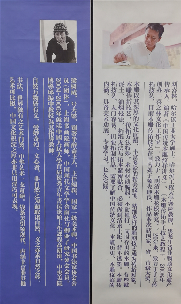 系列展首场展览是梁树成、刘喜林的作品展:《文心雕龙》。展览分叁部份,即大梁书法作品、刘喜林的古代木雕花藏品及传拓作品,以及二人合作作品六十余件。