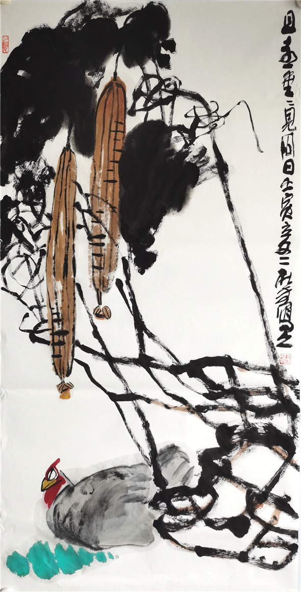 杜未近期简笔“写”出来的作品,比如《远瞩》、《凝香》、《多寿》、《古柏吟》、《寿喜图》、《花枝烂漫》、《芙蓉国里尽朝晖》等等,都是情之所至,一气呵成,一“写”而就,用笔老辣,结构严谨,形象夸张,构图洗练,寓意深刻。或者赋予作品一个美好意蕴,或者赋予作品一个灵魂,都有着非常明确的感情指向,表达了画家炽热的情感和强烈的人文情怀。这一“写”,写出了意态超迈,写出了古拙与疏简,写出了大气与超迈,写出了雄强与霸悍,写出了中国传统文化的韵味,写出了至刚至大的传统笔墨精神。“写”好画,需要书法功夫,需要骨法用笔,更需要传统文化做底蕴。大写意画,看似漫不经心,逸笔草草,实则法度森严,大有讲究。这里需要弄清楚一个概念,就是何为传统意义上的大写意花鸟?写意花鸟画一般分为小写意和大写意。小写意的特点是真实、生动,是花鸟中一种比较普遍的画法。而大写意是中国画里面一种难度较高、不易掌握的画法,需要有过硬的笔墨功夫,在表现对象时,往往带有很强的主观性,造型大胆、夸张,具有很强的抒情性、创造性和趣味性等特征,给人一种潇洒、气派、落落大方的艺术感受。一般说来,写意画着重于表现物象的神韵和画家的情致。当然,写实是写意的基础,写意是写实的升华。这里所说的升华,不是一般意义上的升华,而是基于美学范畴的诗意的、以简为尚的升华。而大写意之“写”,区别于西方绘画的“绘”与“画”,它是基于书画同源的笔墨精神,是以具有抽象性、韵律美和节奏感的书法艺术来写形、写境与抒情,是画家情感的诗意呈现。大写意之“意”,则是艺术作品所呈现出来的意念、意气、意境、意态和意趣。总之,写意画讲究的是“写”,讲究的是“意”,重视形似而不拘泥于形似,追求“不似之似”与“似与不似之间”,强调的是作者的个性发挥和“意气生发”。至于大写意的“大”,正如孟子所说,“充实之谓美,充实而有光辉之谓大”。它往往能表现出人格的伟大,心灵的伟大,以及集诗、书、画于一体的文化意义上的精深博大。读杜未大写意花鸟不难看出,他在追求至刚至大的传统美学精神的同时,赋予了作品传统文化的精髓,这才是更高级的绘画表现形式。其可贵之处在于用具象的花鸟、鱼虫、蔬果等生活中常见的题材,来表达自己独特的内心感受,以及关于人、轮回、生与死、幻像等玄而又玄的概念。画面上的具象,表达的恰是画家更为抽象的内心世界。