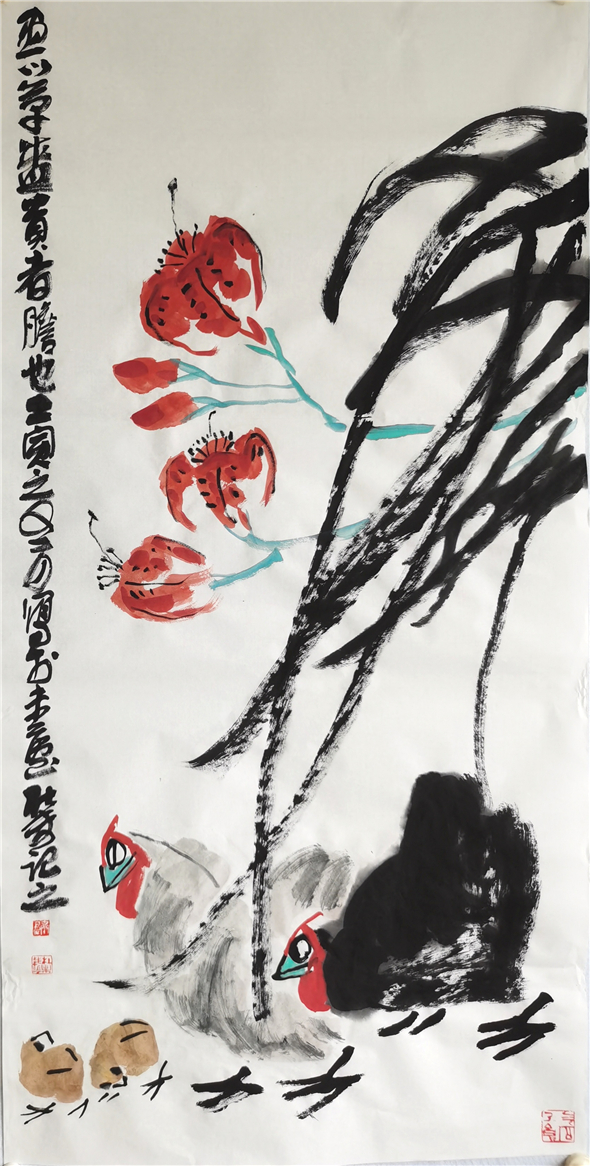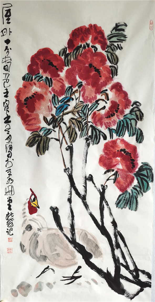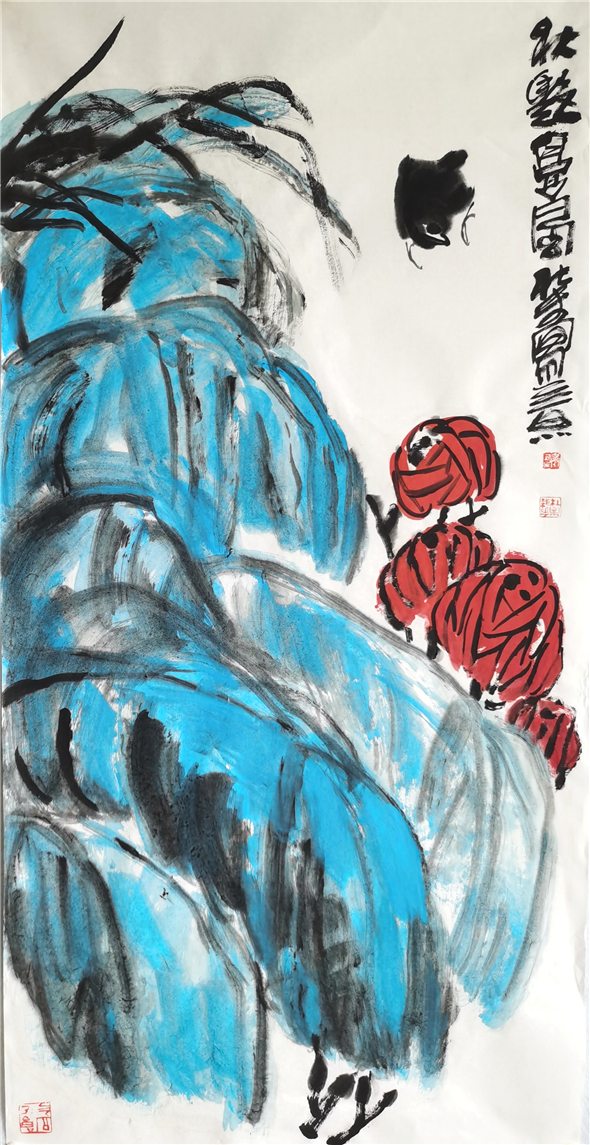 【中网资讯书画】读杜未的大写意花鸟,有个非常深刻的印象,就是“写”。写意画,当然首先要强调一个“写”字,所以他的作品不是“绘”,不是“画”,不是“描”,更不是涂涂抹抹的加工制作,而是大刀阔斧的写,大气磅礴的写,疾风骤雨的写,气吞山河的写,狂草一般的“写”。对于杜未来说,不“写”,就无以传承正宗中国大写意精神;不“写”,无法将稍纵即逝的顿悟表现出来;不“写”,就不能够表现自己想表达的意念、意境、意气、意态和意趣。正如他自己所说,“我的画,写我的感情,他们全都来自于传统和生活。”因此,他的花鸟寓性情于法度之中,寄墨法以文心雅趣,笔之所至,意之所至,心随笔转,墨趣生发。古拙的线条,是他的“心电图”;皺、擦、点、染,是他的脉膊律动;而他精心构建的艺术图式,则是他想要表达的意义、意境、意气、意念或者意趣。