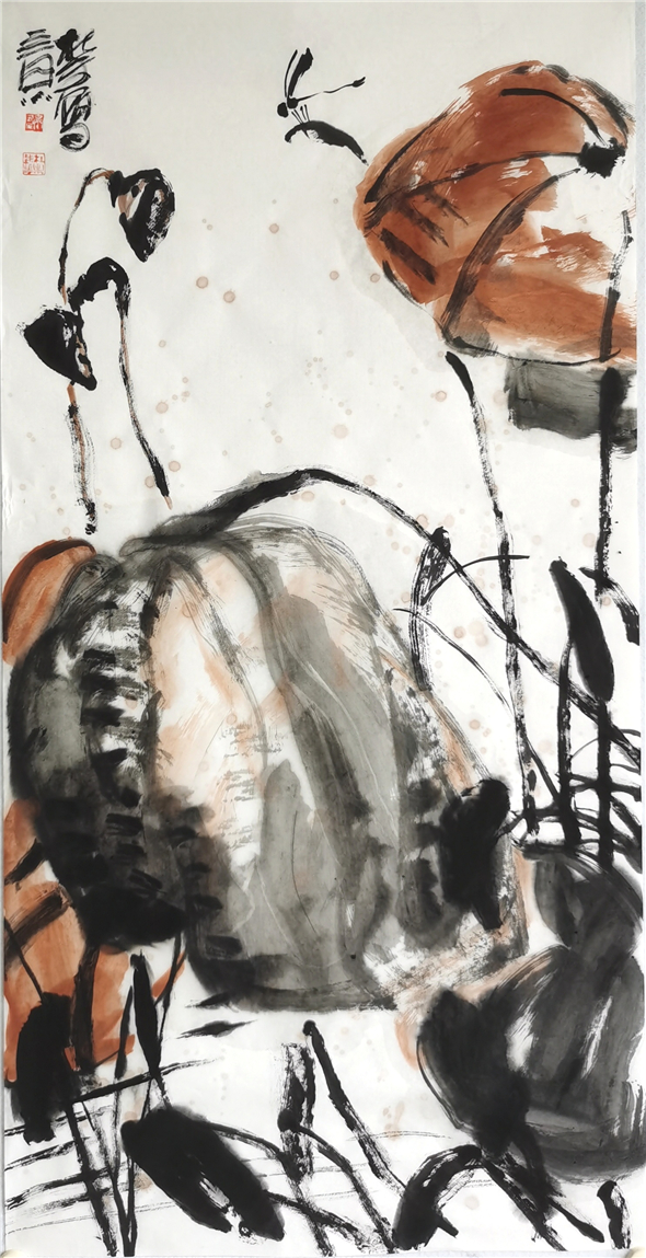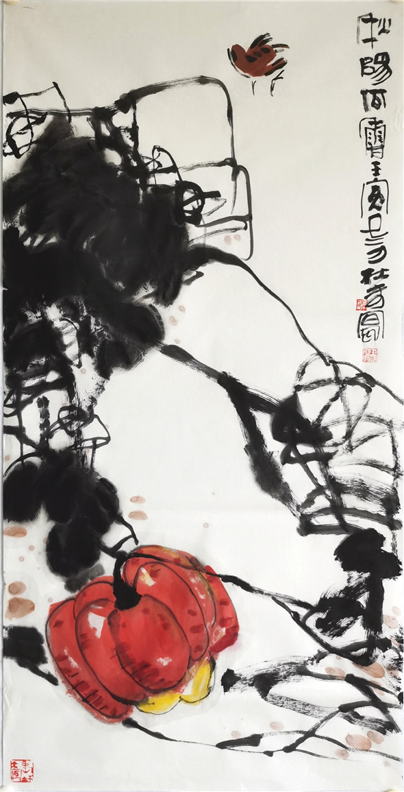 他“写”出来的花鸟作品,由于用笔带有浓厚的金石味道,所以苍茫古拙。宋人陈师道曾在《后山诗话》中说,“诗文宁拙毋巧,宁朴毋华,宁丑毋弱,宁僻不俗。”这里虽然说的是诗文,其实用来品鉴绘画同样贴切。如果说,古拙是其作品“写”出来的味道和气度,是他的作品留给观者的印象,那么,疏简则似乎是他追求的一种人生态度。读杜未的大写意花鸟,可以明显感受到充盈其间的疏简之气。这股“气”究竟是来自于艺术的自信,还是来自于对传统大写意精神的体悟,我们不得而知。但是,有一点可以肯定,就是只有深耕过传统的人,才可能觉悟得到。古拙与疏简,既属于传统中国文化的审美范畴和美学品格,也是绘画作品的一种审美格调。疏简,就是简练、简洁、简淡、简括、简约,是一种高级艺术语言,是艺术的高度概括、高度抽象和高度凝练。从哲学层面来说,简,就是九九归一。所以,老子说,大道至简。杜未的花鸟,多用简笔写就。看似寥寥几笔,逸笔草草,但是,简约并不简单,简洁并不简陋,简淡但是丰富。每幅作品从立意到布局,从用笔到使墨,从结构到赋彩,都一丝不苟,匠心独运,笔墨凝练且富于变化,都在精心营构属于自己的艺术范式。一花一叶的生命状态,一枯一荣的岁月轮回,无不在画家心灵烙下深刻的印记,并给予画家诸多人生启迪和思考。也许正是这种岁月沧桑,赋予画家一种散漫与简淡的人生态度。笔墨的多变,显示出他的繁恰是简,他的简又恰是繁。正如他自己感悟的一样:黄宾虹和八大,一个繁,一个简,但是殊途同归,黄宾虹千笔万笔,却是一笔;八大一笔两笔,恰是千笔万笔。简也好,繁也好,都不是目的,目的在于繁简背后所表达出来的生命意绪和意态。正是在这个意义上,齐白石才说:画在似与不似之间。这似与不似,才是画的性灵安居之处。平淡未必无奇,作平淡而止于平淡,平淡之外无物也;平淡之外须有物,所谓弦外之音,则平淡自不平淡。杜未的疏简也是如此。仔细品读他的花鸟,平淡自然之中,总是透出一股呼之欲出的机趣与意绪。我以为,写,简写,简笔,恰恰是杜未花鸟作品的灵魂,也是大写意花鸟的核心价值所在。纵观中国画史,简繁与画格有着直接的关系。一般来说,画格越高,技法越简;画格越低,技法越繁。简是高度概括。凡是艺术水平高的画作皆技法简单、色彩简单而意趣深厚。相反,“过分讲求技法者,或因意趣薄而以技法掩饰,或只知技法而不知意趣为何物。”(陈子庄语)