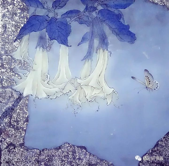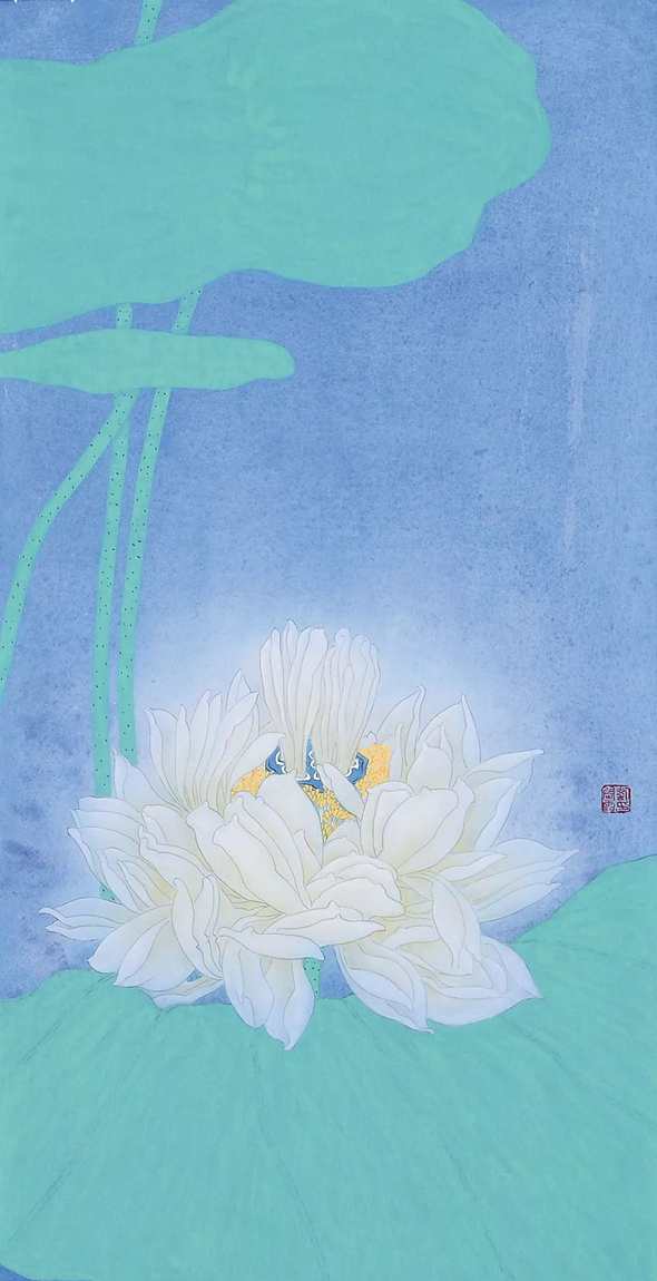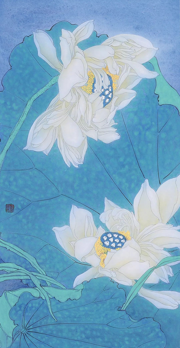 愚曾多次在撰文中认为中国画在这四十年来,得到了长足的进步和突破性发展。工笔更是如此,众所周知,工笔花鸟画是中国传统绘画重要的流派之一,也是世界艺术宝库中的一颗璀璨夺目的明珠。严谨精致花鸟创作是一种特殊的画种与技法。尽精微致广大,上世纪80年代,愚有幸常侍奉俞致贞、刘力上、田世光、黄均等前辈左右,也曾与喻继高、王庆生、詹庚西、龚文桢诸兄交往甚密,他们的表现方法工整细致,先匀后染,设色艳丽,在对花鸟描绘的过程中,用灯箱通过白描造型、勾勒填彩,再采用分染、罩染、统染、点染、接染、撞水、碰色等技法,产生栩栩如生、精致动人的艺术佳作。当然詹庚西、龚文桢等后来在深入生活写生创作中开始关注画面的整体变化和全景构图。到了何家英、江宏伟他们这个年龄段工笔画出现了全新面貌,他们在传统文化的基础上,大胆尝试新法,把现代审美,结构组合,块面装饰,西方透视,当代人文引入创作,突出了渲染,强化了对比,营造了时代感、时间感、整体感、空间感……而刘尉霞的作品自然得益于后者。