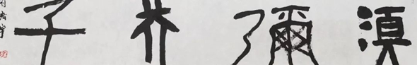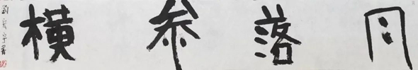 观宏宇近作,需要大家回归艺术本体来看。笔势古劲遒厚,取碑版造像之态,柔毫劲腕,斗起直落。用笔能感觉出来直入平出,不加修饰动作。顺笔书写,气力饱满。浓重的点划与笔干墨尽时枯毫飞白形成对比和节奏变化,书之奇奥之处也在于此。