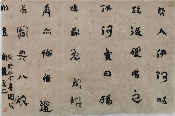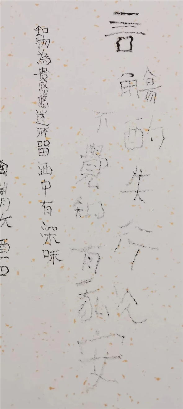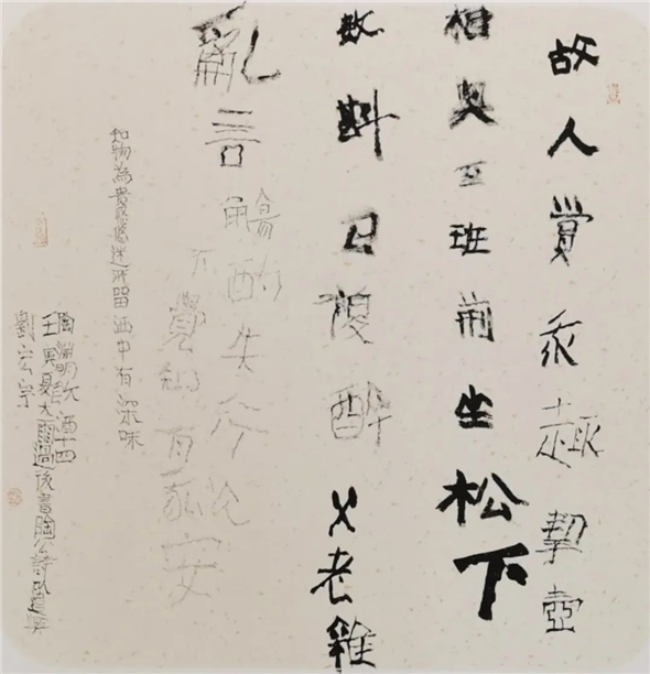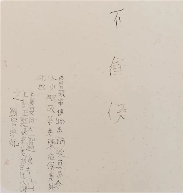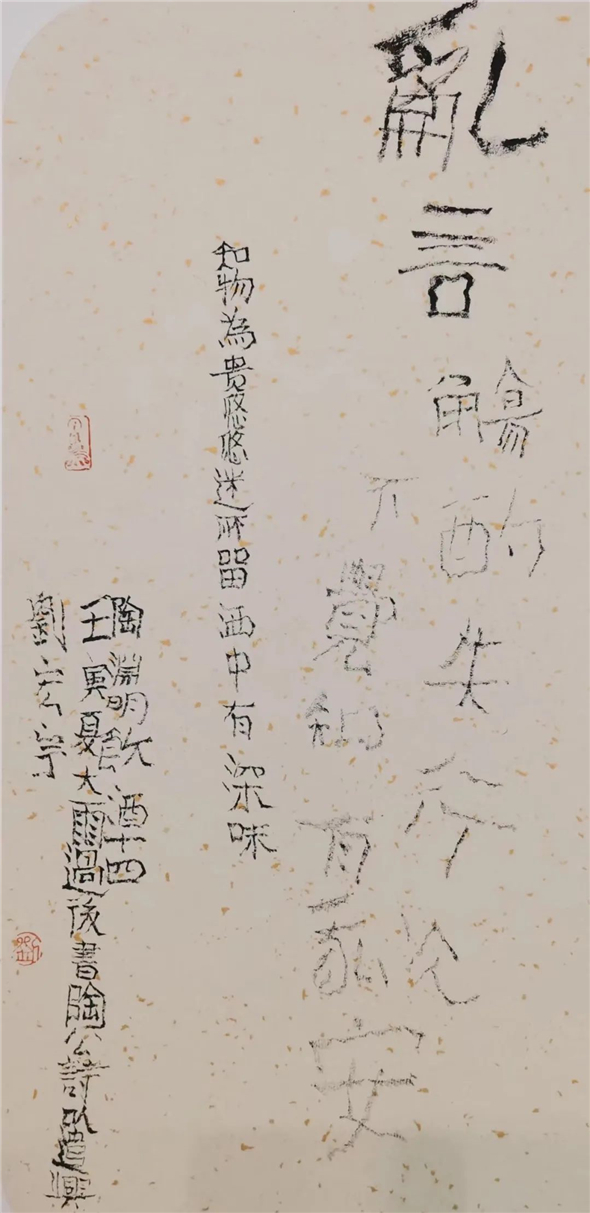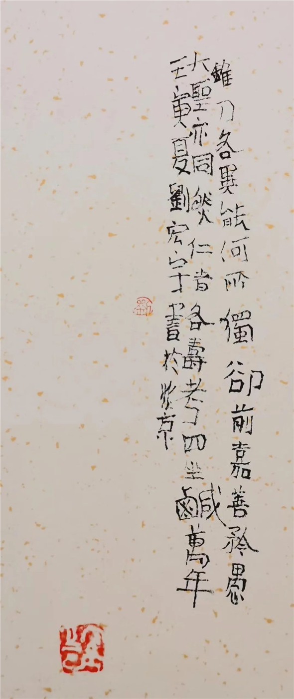 书法家刘宏宇,先入中央美术学院,习字读书;再入中国社会科学院研究生院,读书习字。尤用力于金石学与书法艺术关系之研究,知行合一,读写并进,十余年一凳一案,一灯一人,一日未断。见者谓其苦甚,宏宇自得其乐。不知此一时代青年书法才俊中还有如宏宇般苦行者?或曰,非此,不可得见宏宇作品高古浑厚又天真烂漫之神韵。