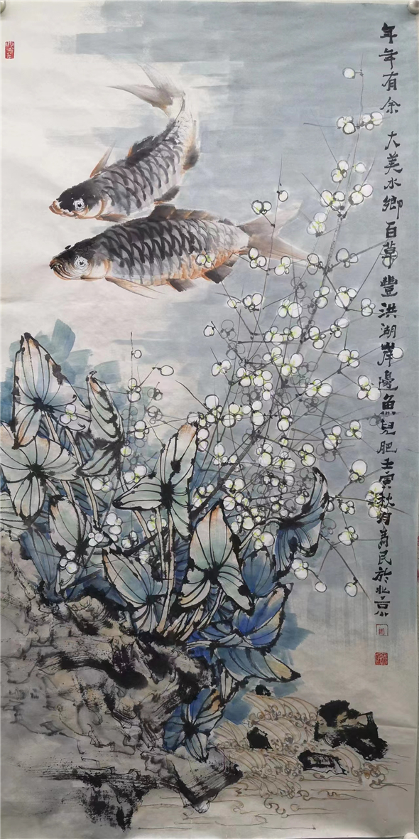 三为真诚心态。观其绘画,在其笔墨、设色上甚少强烈之对比。基本上是笔笔分明,可见其创作心态之真诚,不玩肌理、制作等技巧。书画之传承,多以先工后意,先收后放为主。如郑板桥画竹之三个阶段:眼中之竹,心中之竹,手中之竹一样。所谓外事造化,中得心源,画者之临摹、写生至创作是需要长期积累方能完成的,不宜操之过急,这就需要画者有良好之心态,循序渐进,方能达至高之境界。余为民心中有丘壑,从其线描作品可以看出,其深入刻画、渲染即可为工笔作品,简笔即可为小写意之作品,放逸笔墨则可为大写意之作品。其发展之潜力巨大,值得书画艺术界关注,藏家青睐也!