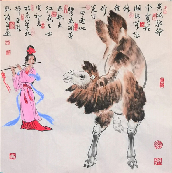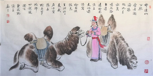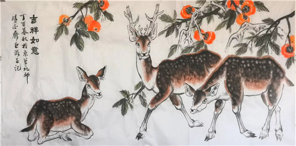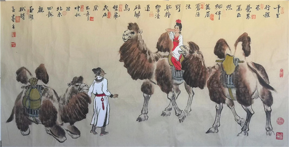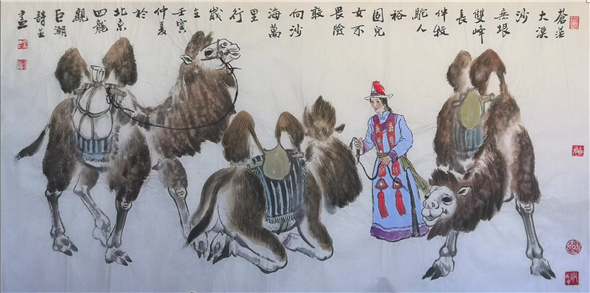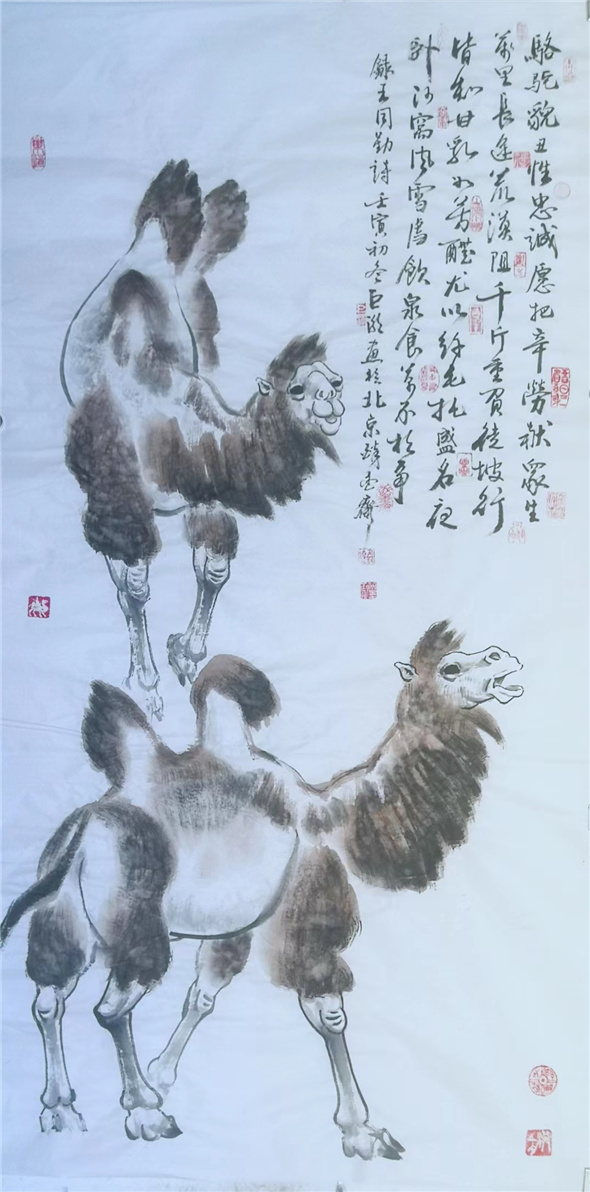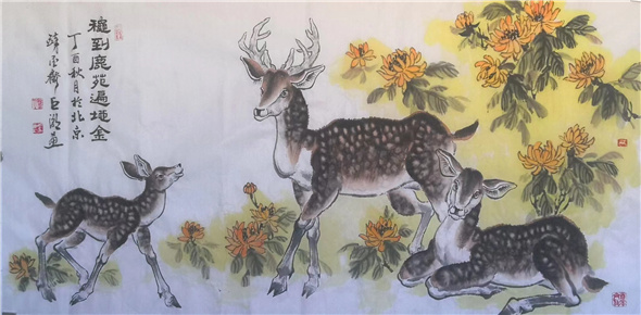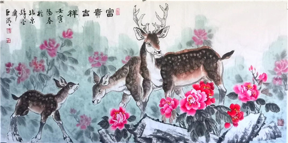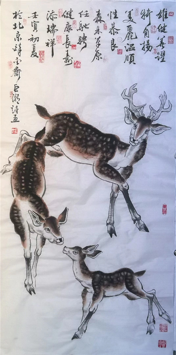 我与巨潮先生相识多年,曾有一句诗送他:巨潮涌张掖,声声动山川。他擅长水墨人物画,人物造型优美,生动传神,在许多展览中和报刊杂志上多有佳作问世,颇得业内好评。但是近些年来他笔锋一转,又独辟蹊径地画出了一大批动物画,尤以梅花鹿、骆驼见长,带给人们更多的新鲜和奇异。骆驼、梅花鹿都是河西走廊常见的动物。骆驼素有沙漠之舟的美称,在极端恶劣的自然环境中如戈壁、沙漠里不吃不喝可坚持十数天之久,具有忍饥耐劳、坚韧不拔、忍辱负重、艰苦卓绝的品格;梅花鹿体态优美,行动敏捷,性格温顺,色彩绚丽,自古以来就被人们誉为吉祥动物,象征着健康长寿,寓意着财源广进。巨潮先生常年深入驼群、鹿场画了大量写生,将梅花鹿与骆驼的生活习性结构动态研究得深入透彻,了如指掌,在画水墨动物画的基础上经过多年潜心钻研,勤奋实践,独创出了“没骨泼彩点水动物画”。他掌握了娴熟的泼彩技巧,运用独特的工具材料,水、墨色渗化交融,浑然一体,点、线、面巧妙组合,相映成趣,画面色彩斑斓,水墨淋漓,变幻无穷,妙造天然,十分生动地表现出动物皮毛的特性和质感、量感、空间感。凭着他多年的绘画历练和多方面的艺术修养,将动物画与山水画、花鸟画、人物画相结合,营造动物特定的生活环境,赋予其生动的姿态表情,将人文精神贯穿于动物画的意境之中,格调高雅,品味纯正,灵秀俊逸,意味隽永,于质朴纯厚中闪射出灼灼光华,凸显出强烈的地域特点与浓郁的时代气息,在美术百花园之中绽放出又一朵奇葩。