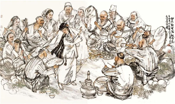 刘克宁在新疆前前后后近二十年。他从学校校到工作,到建立家庭,走上艺术之路都是在这片士土地完成的。至今每每回忆起他说新疆是第二故乡,这里存在着说不清的成长记憶。从知青到大学,从文化馆干部到电影学校政工教师,从报社期刊记者到专业美朮编辑,使他从学生到画家完成了初步成长之路。刘克宁不怕苦累,勤奋好学,注重写生和创作素材的收集。不论是去文艺辅导还是牧区写生采风,从来都是速写本不离手,尤其是看到黄胄先生画速写后更感觉到速写的重要,在新疆期间除了完成多份文学期刊文学作品插图和编辑设计外还常有速写写生见诸於报端,这期他积累速写作品数百幅,足足好多册。新疆天山南北生活着几十个民族,北疆的哈薩克和回族,南疆的维吾尔,塔吉克族都是刘克宁筆下表现的对象。他深入牧区,农村,从草原到农舍都留下了他的足迹,为了写生他还学习了简单的民族语言,日久生情,他对这片读地产生挚爱,所以他的西部人物作品一出现就在画坛产生很大影响。如在中国美协画展中获金奖的《巴扎图》,写意中国画大展中获银奖的《欢乐新疆》和文化部展获银奖的《新疆好》,和中国美协21世纪澳大利亚展获铜奖的组画《新疆风情》等等,都是来自这片土地的题材。正如著名理论家孙克所说:刘克宁筆下维吾尔人哈薩克人是鲜活的,有生命力的。因为他了解他们。提筆一画就象。不是一些走马观花,去一趟新疆猎奇性的写画。这些创作和成就使刘克宁深深地懂得一个道理:创作来源于生活,作品要有情感。