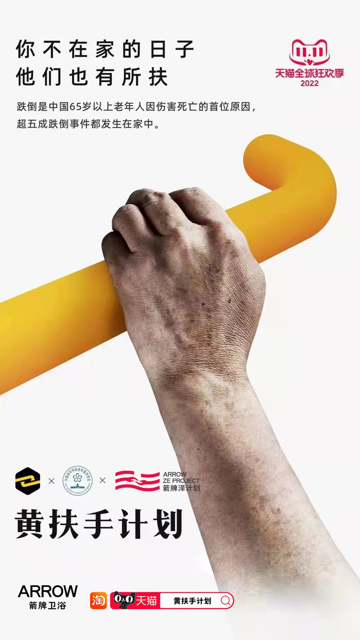 一直以来,箭牌泽计划都在呼吁社会能够更多的关注老年人的健康生活,2022年双十一,天猫联合中国老年学会和老年医学学会、箭牌卫浴、箭牌泽计划共同发起“黄扶手计划”,向社会送出5万个适老扶手,给老年人带去精神和生活的支柱力量。