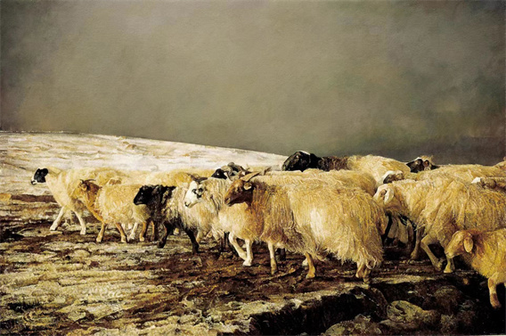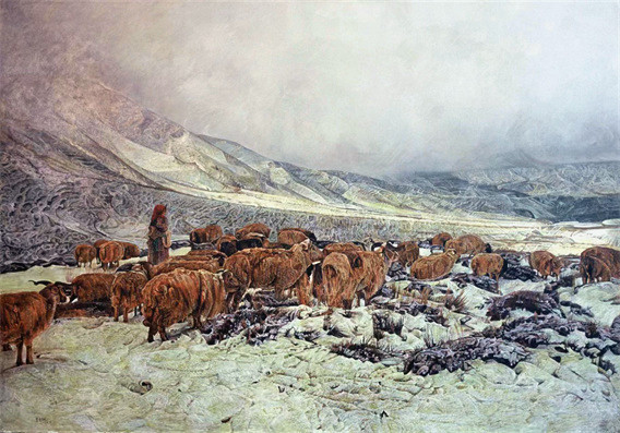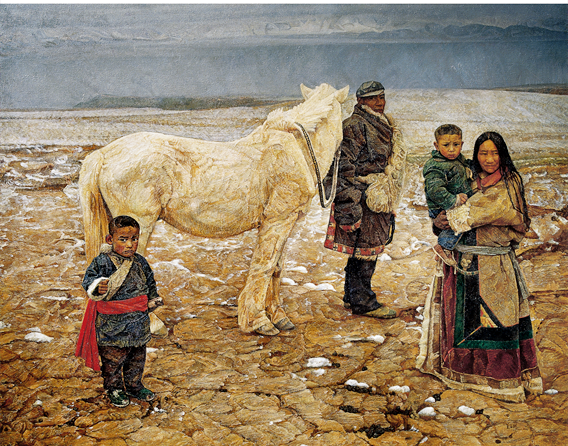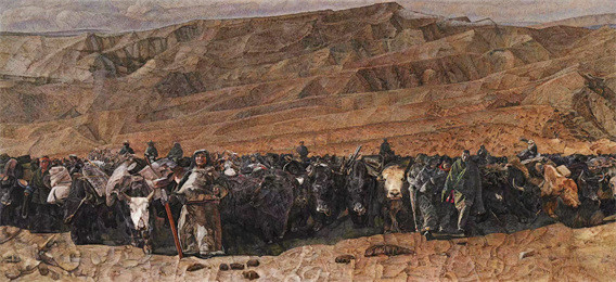 1990年起他带着对中国北方自然的感受,到了西藏,在那里,他看到了更为原始的自然和更为广阔博大的大地,并为西藏的人与自然所感动,诱发起强烈的表现欲望,作品中藏民的身影和大地的身躯联系在一起,画面的气氛往往是凝重的。在造型上,人和环境密不可分,同样都是生命的存在,我不敢说他的每一件作品都有足够的分量,但是,象《出岗底斯山》《大牧场》《唐古拉原野》《唐古拉北线》等作品,的确展现了令人惊心动魄的视野。这些作品像宽银幕电影一样,摄取了横空出世般辽阔的高原、天空和大地。形象的质地坚实密集、画面的节奏紧尽连绵,天与地浑然一体,色泽浓重沉郁,空间却舒放宽广。这些画作,让人在精神上荡涤凡间的浊尘,向往永恒的境界,这些曾经感动过兰力斌的景象,同样给人以永恒的感动。