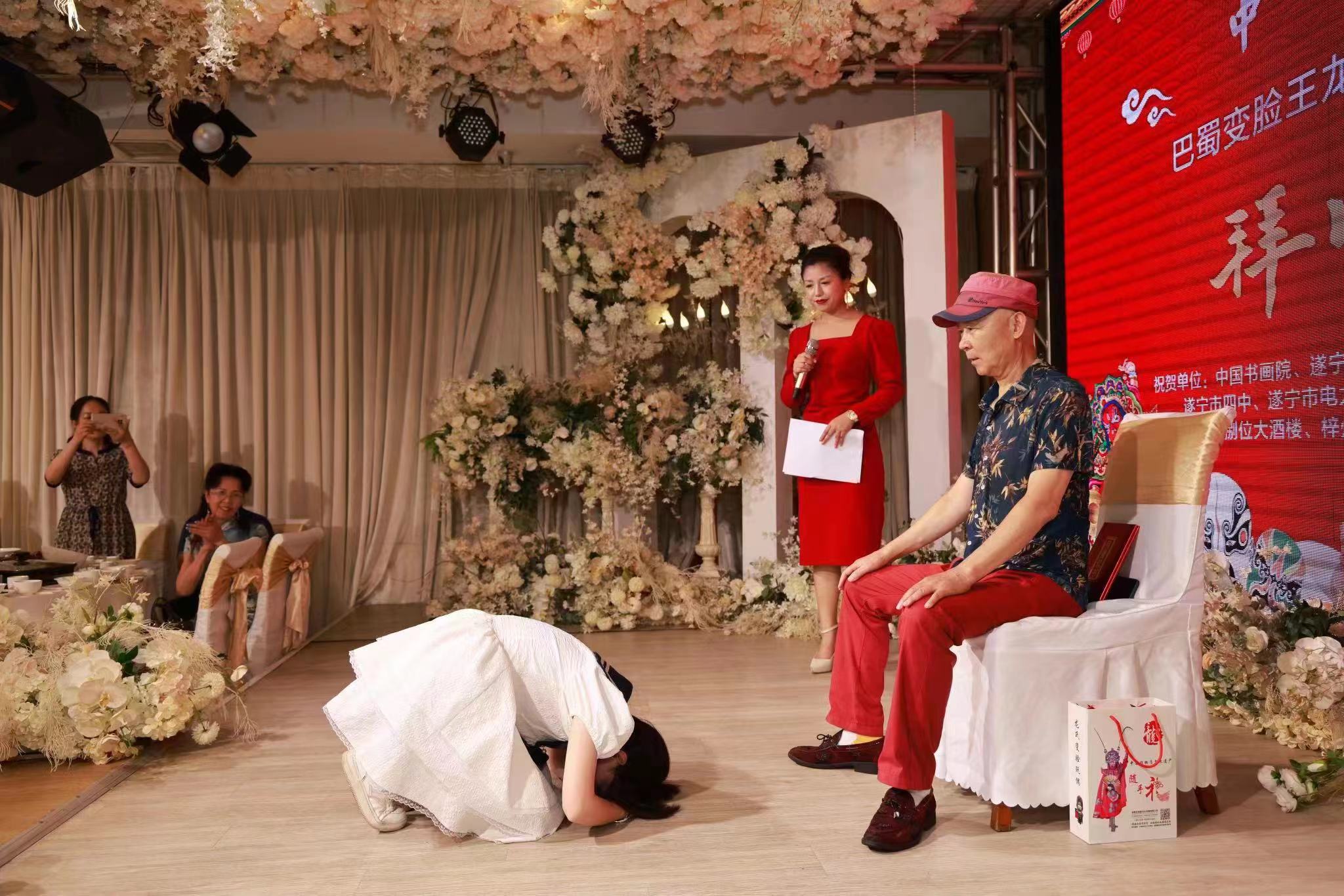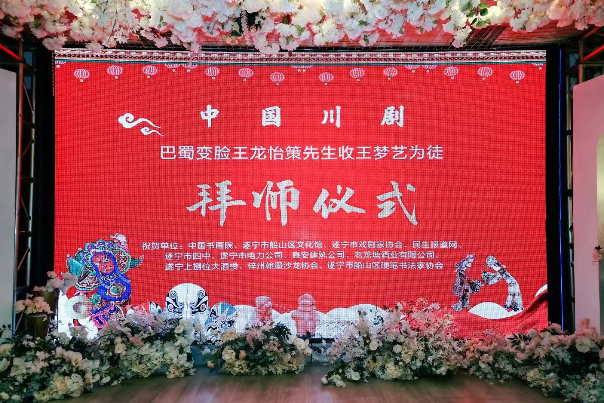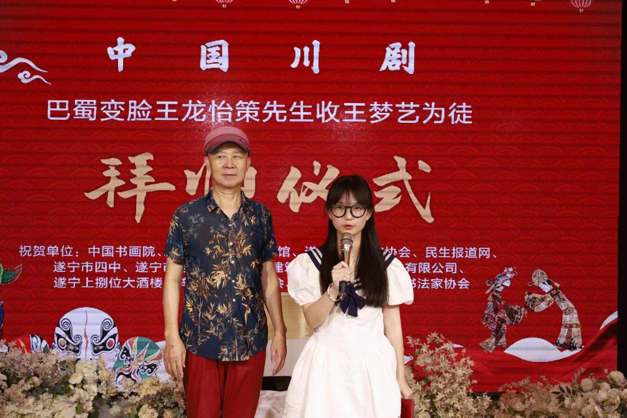 7月11日上午,川剧变脸大师龙怡策在遂宁举行隆重收徒仪式。著名画家王红莉女士自京赴川亲临见证,并送赠送书画作品以示祝贺。龙怡策、国家二级演员、中国戏剧家协会会员。