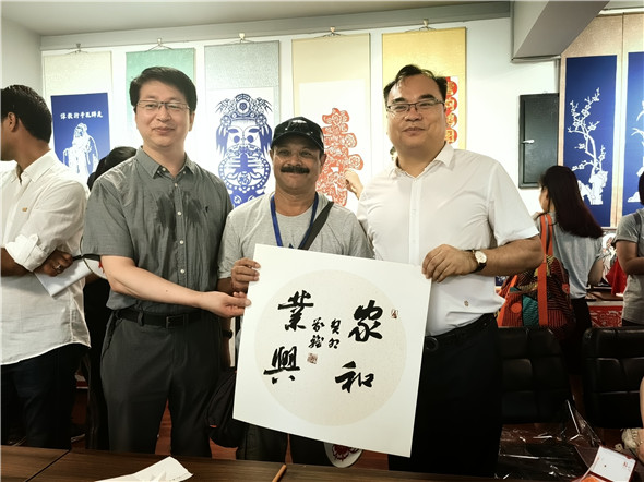 张富贵先生现场挥毫泼墨进行艺术创作,吸引了各国艺术家们在作品前驻足,精彩的艺术作品让各国艺术家流连忘返。中国书法作为人类非物质文化遗产和中国传统文化的典型代表,不仅在为人民服务、为社会主义服务和建设文化强国的过程中发挥着不可替代的作用,而且在中国与世界各国之间的文化交流中也具有难以替代的特殊地位和作用。中国书法是认知中国文化的窗口和途径,是架起不同文化间沟通的桥梁和纽带,是搭建彼此相互学习、相互交流、共同提高,增进彼此了解、信任和友谊的平台,更是中国文化外交的重要组成部分。