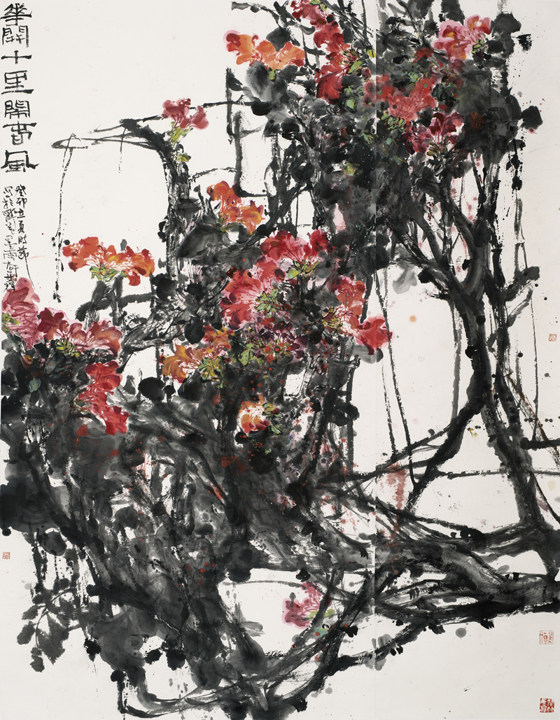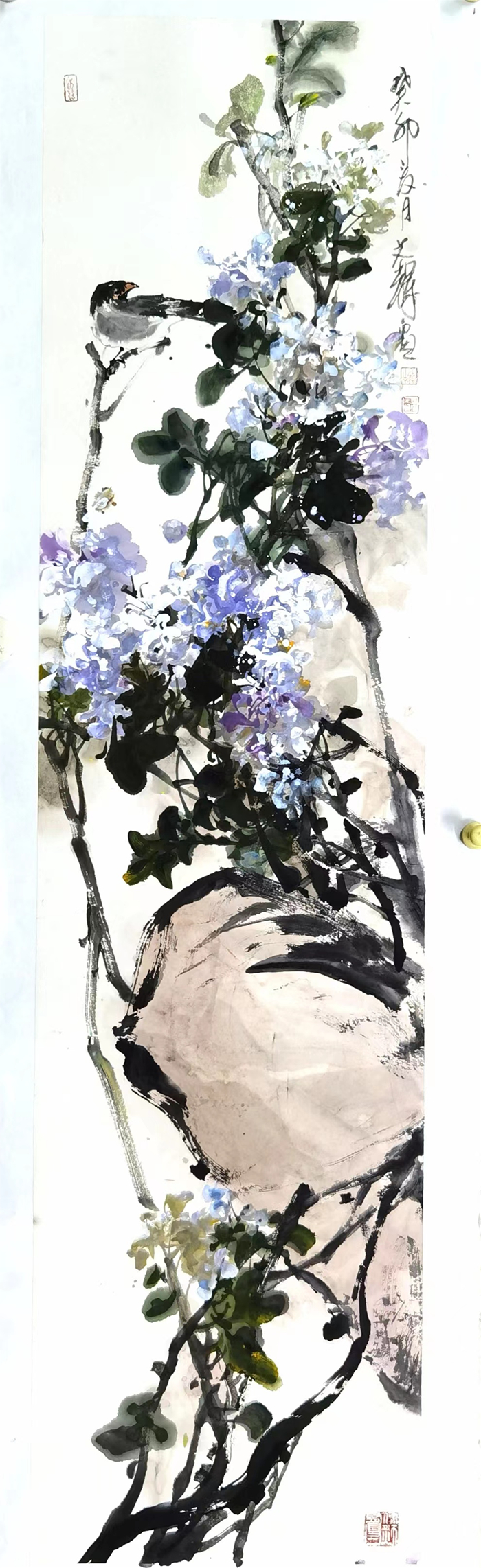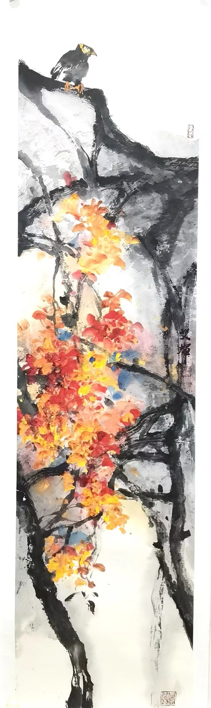 她这次展览的作品是由百余幅版纳写生的花鸟为主体,加之一些小品、没骨画以及大型创作几个板块组成。