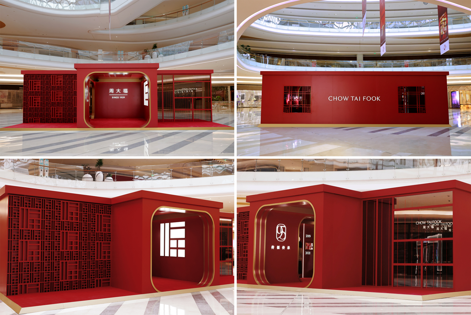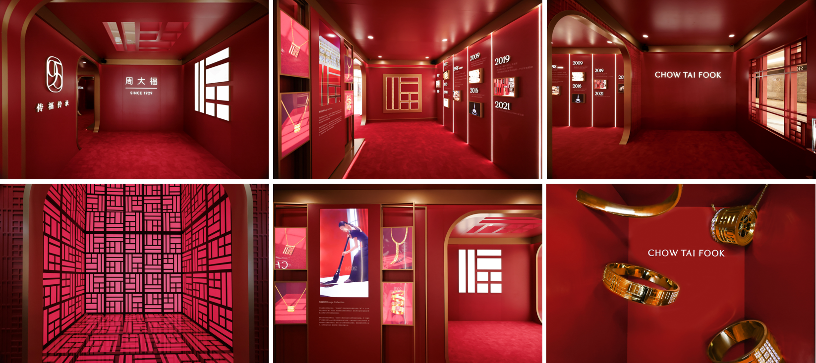 整个展区以“福”为灵感,入口处设置了两面引人瞩目的“福墙”,特色“福”字雕刻墙和镜面墙设计,在霓虹灯映衬下,给观众带来无限可能的感觉;步入展区,满载着光辉发展历史的纪录墙引领观众深入了解周大福在珠宝领域取得的进步与成就,及其标志性产品“传福系列”的诞生;
