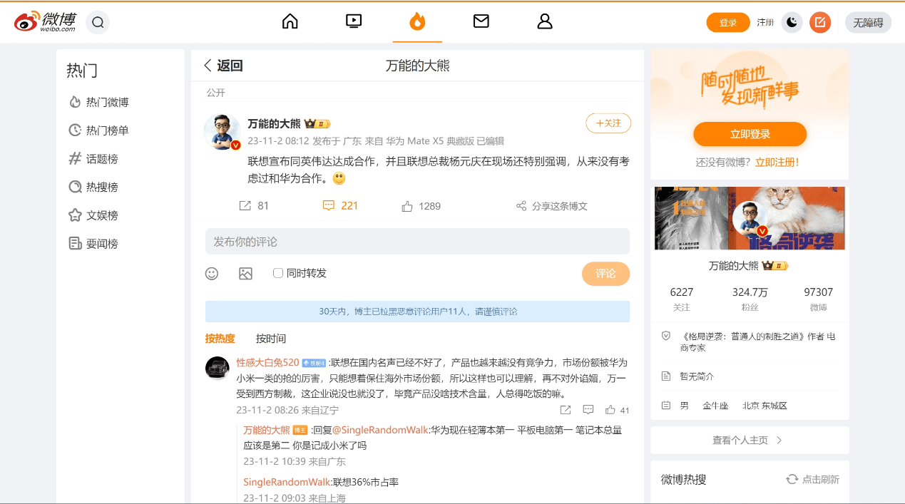 2023年11月2日,新浪微博账号@万能的大熊发布原创文字微博,称联想宣布同英伟达达成合作,并且联想总裁杨元庆在现场还特别强调,从来没有考虑过和华为合作。