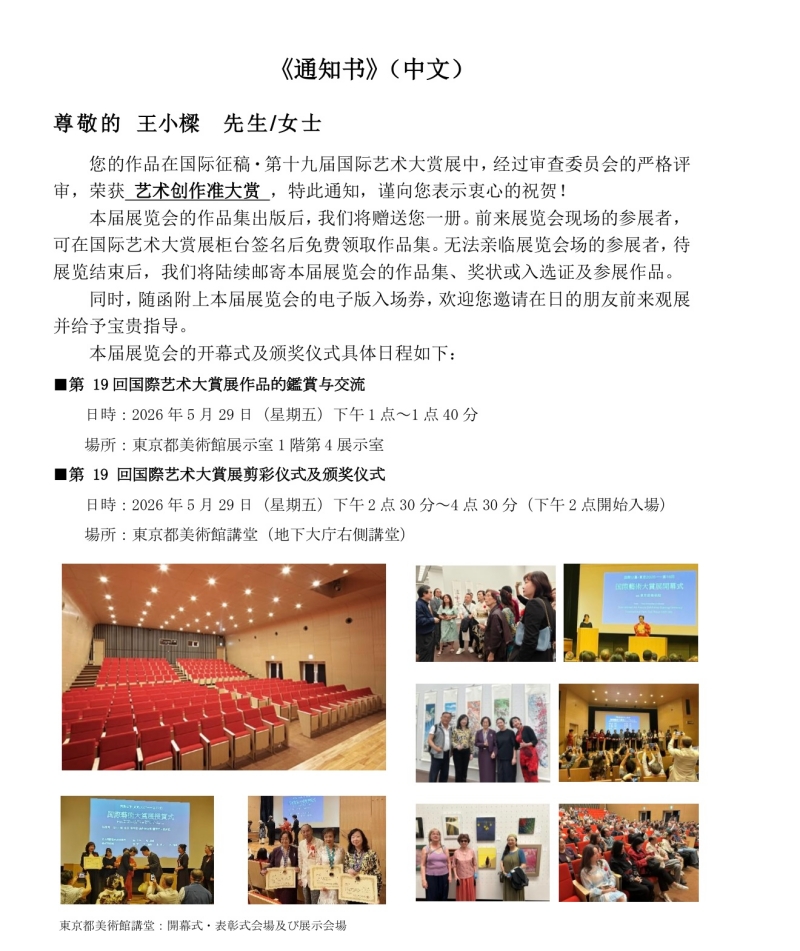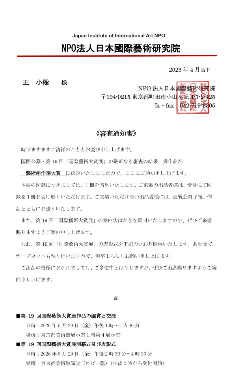 艺术家王小樑获东京2026·第十九届国际书画大赏展"艺术创作準大赏"