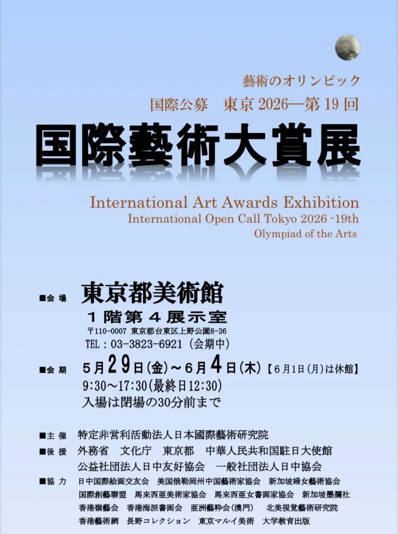 第十九届国际艺术大赏展及文化艺术交流活动将在日本东京都美术馆隆重举办。本次活动由NPO法人日本国际艺术研究院主办,并得到了日本国文化部、东京都政府,以及中国驻日本大使馆、日中友好协会、日中协会等机构的大力支持与后援。